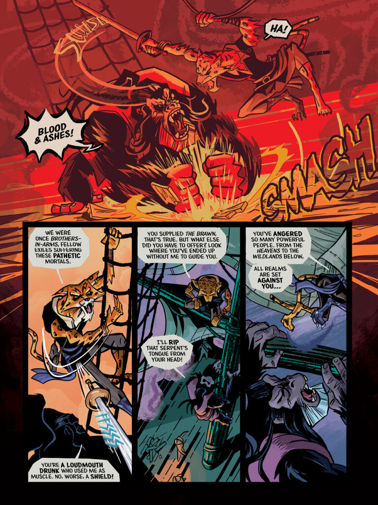 The first, HELL-BOUND is set during a period of seafaring, high adventure for Silverbeard who has been relentlessly pursuing the World Tree – the only route back to the celestial city of Ash-Halla, home of the Gods who betrayed him.  By partnering with the Pirate Brotherhood, Silverbeard is finally set to locate and reach the Tree. With revenge in his grasp, why does the Simian Sailor then suddenly break his agreement and sail away from the expedition? Where could he be heading? The buccaneers send a shadowy figure from Silverbeard’s past, the roguish jaguar assassin Obsidior, with an ultimatum – return or die!